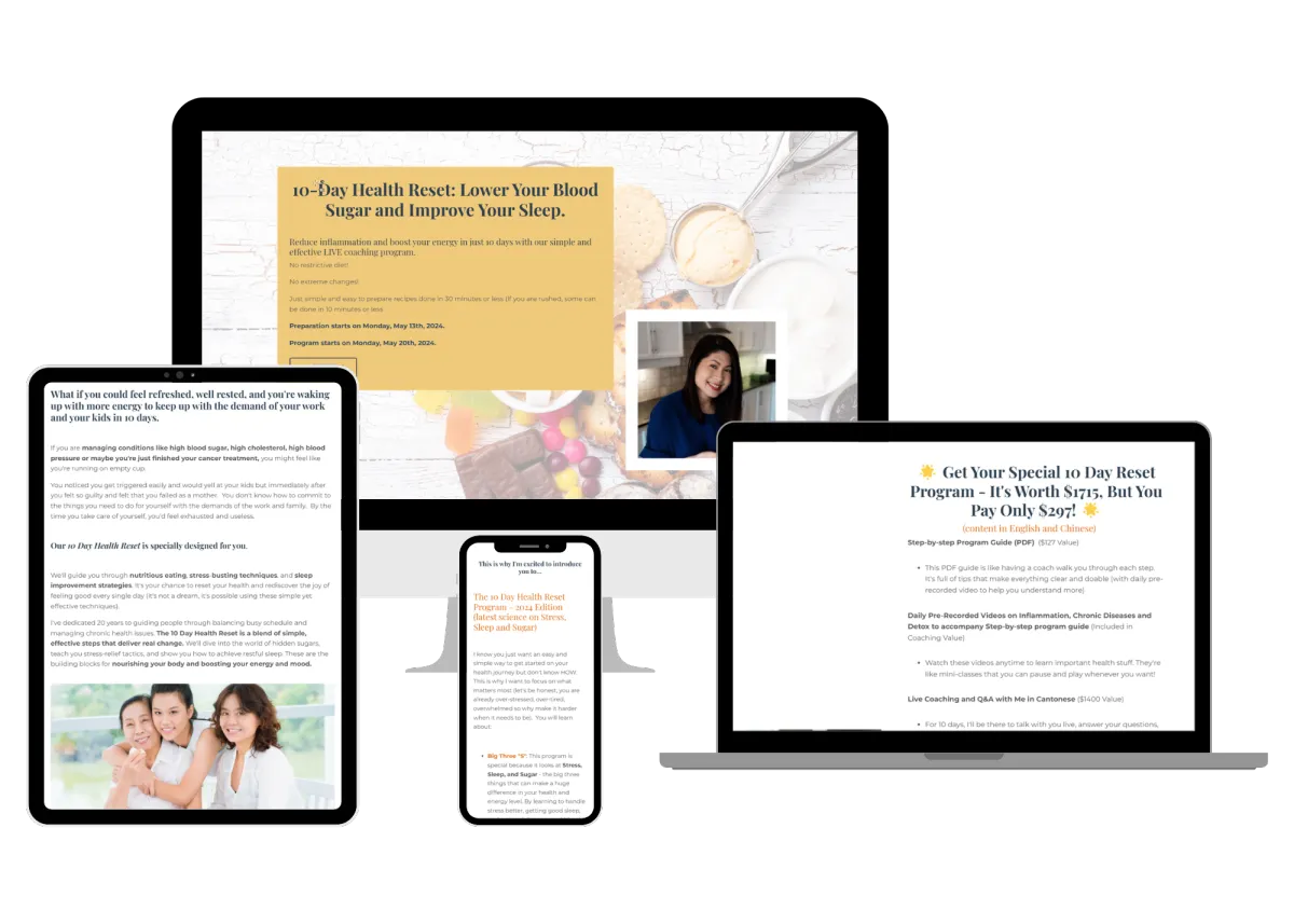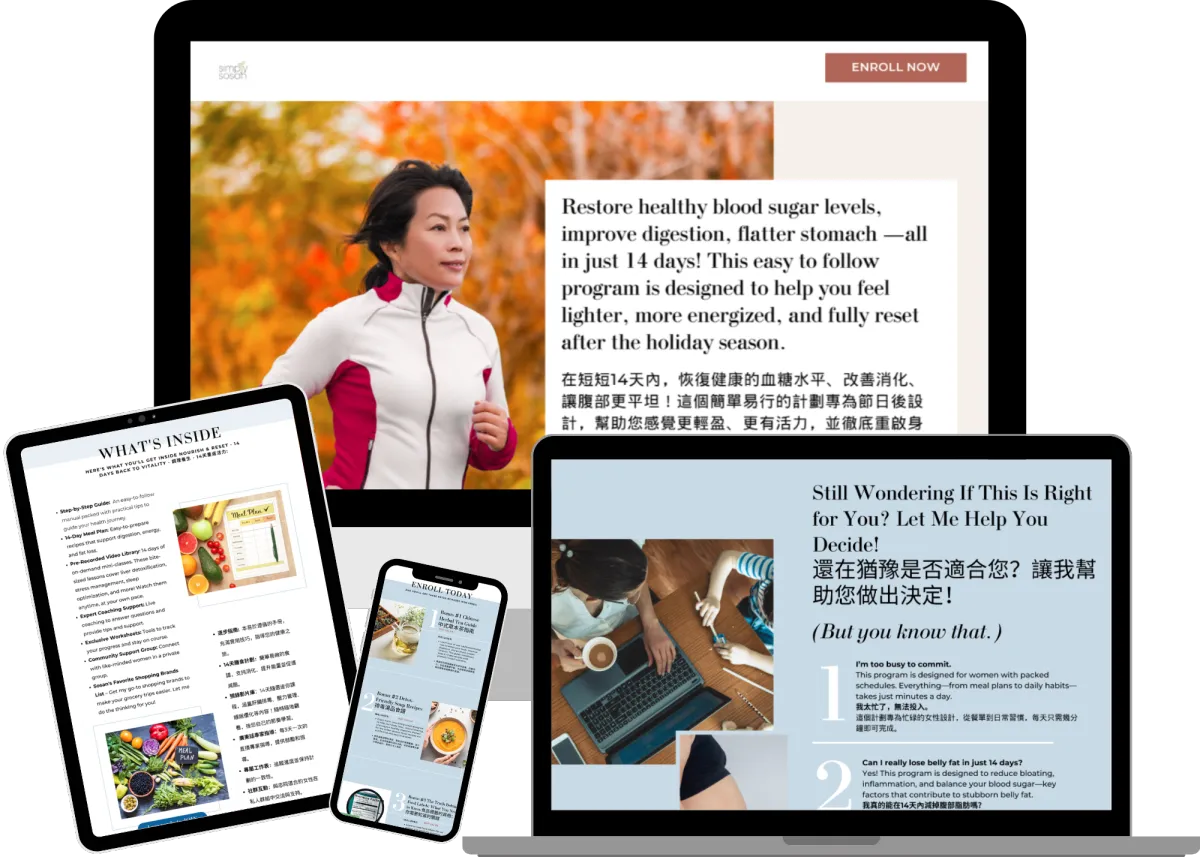 這是一個 10天的引導計劃,專為 40歲以上忙碌的華人女性設計,特別適合正在管理高血糖、膽固醇或癌後康復的女性。無論是節日後、旅行結束、或壓力過大,這個重啟計劃都能幫助您快速回到健康的軌道。
